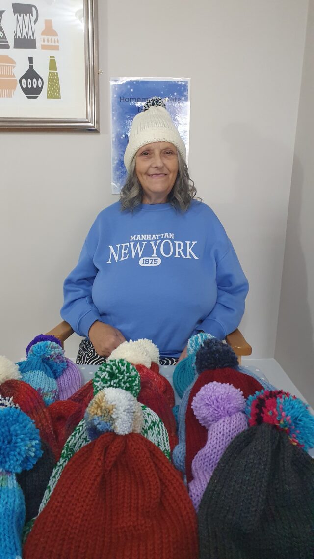 Hazel began knitting the hats over the summer with support from Lifestyle Coordinator Leoni and volunteer knitter Hillary. The hats are now available to purchase for £5 each, with every penny raised going directly to the residents’ amenities fund at Brewster House.