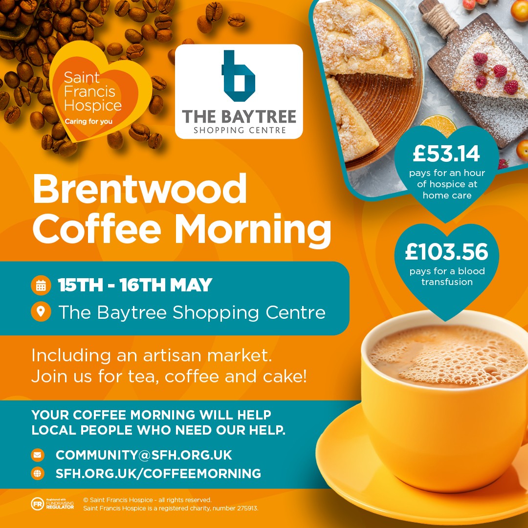 Charlotte Winder from Saint Francis Hospice commented: “We’re delighted to be working with The Baytree Shopping Centre to host Brentwood’s first ever Coffee Morning. Community is at the heart of everything we do at Saint Francis Hospice, and this event is a fantastic opportunity to bring local people together while raising awareness and support for the care we provide across the community. We look forward to welcoming visitors for what promises to be a really special and meaningful day.”